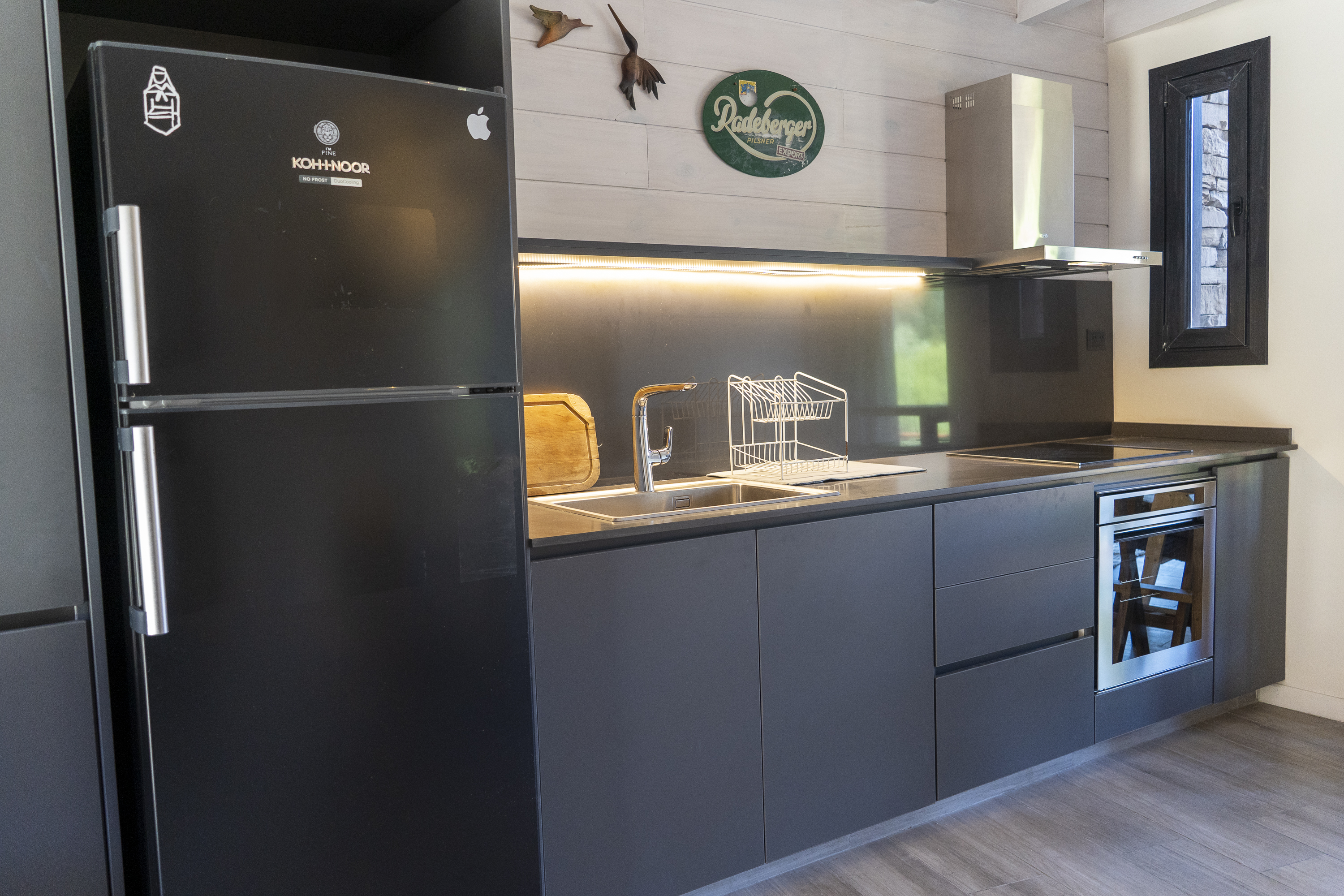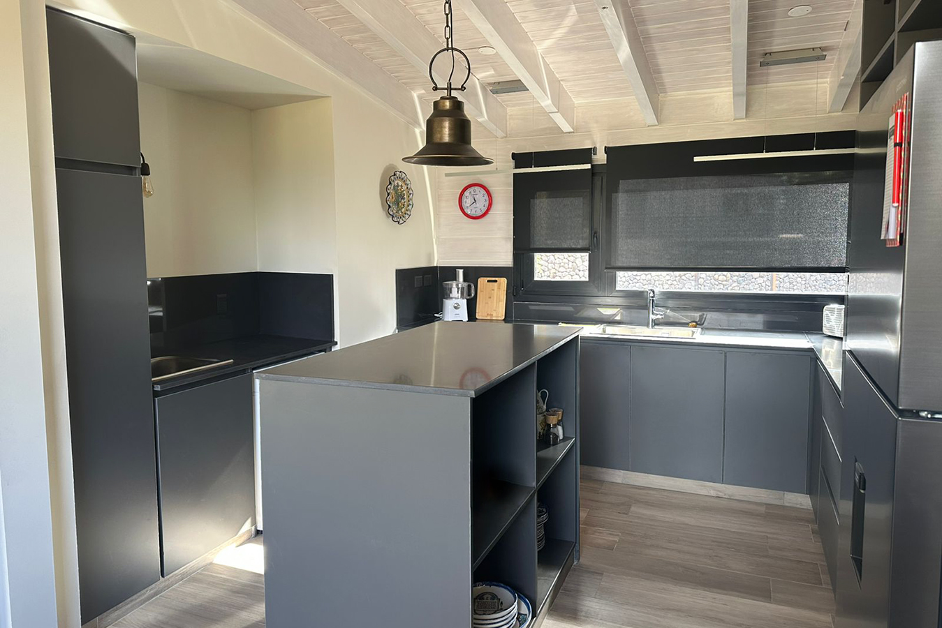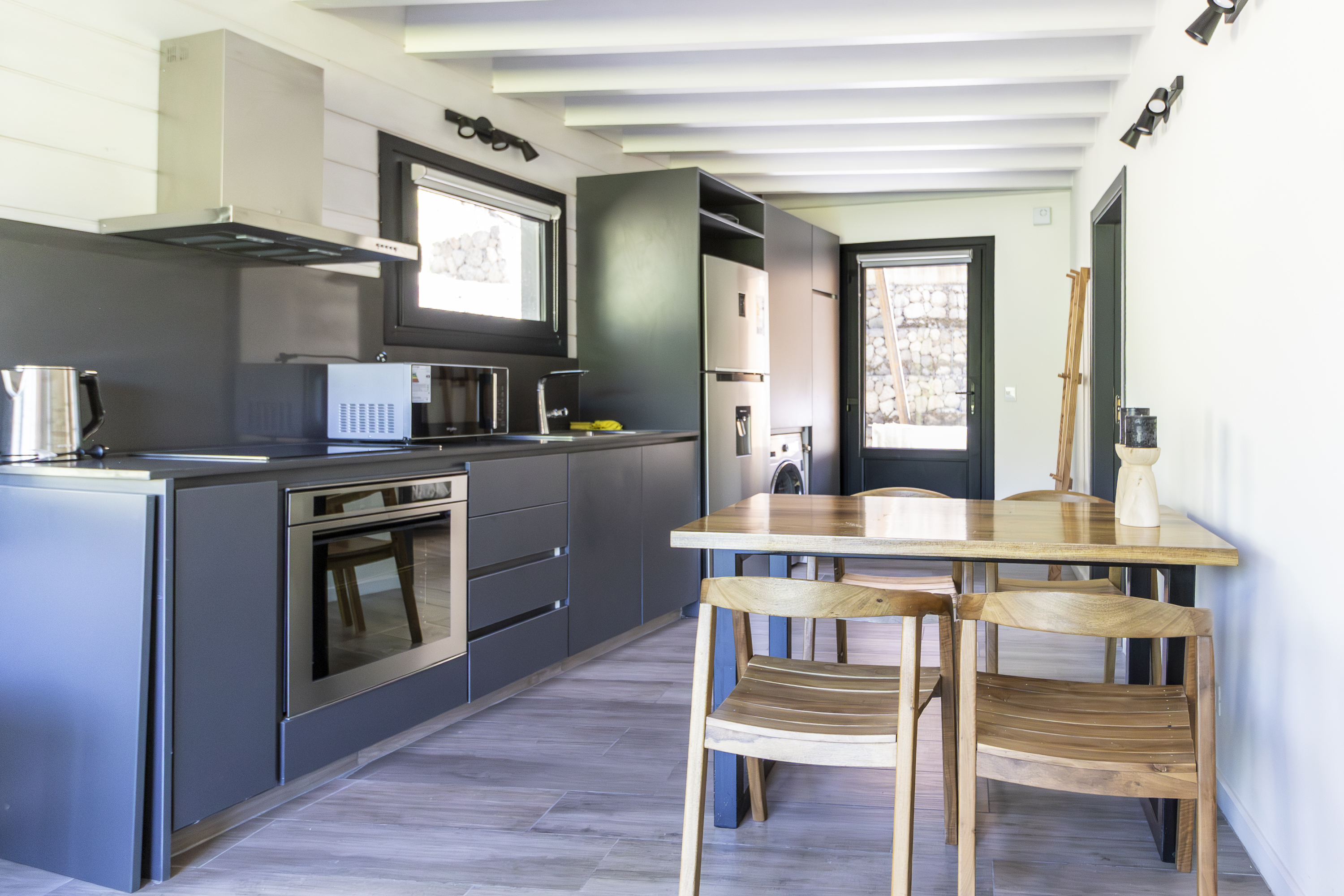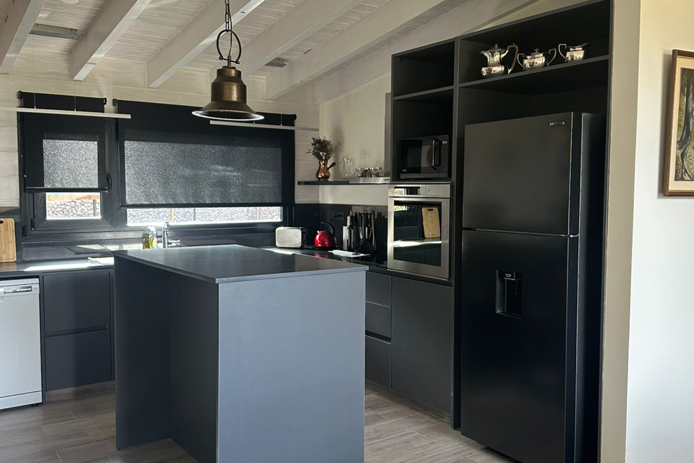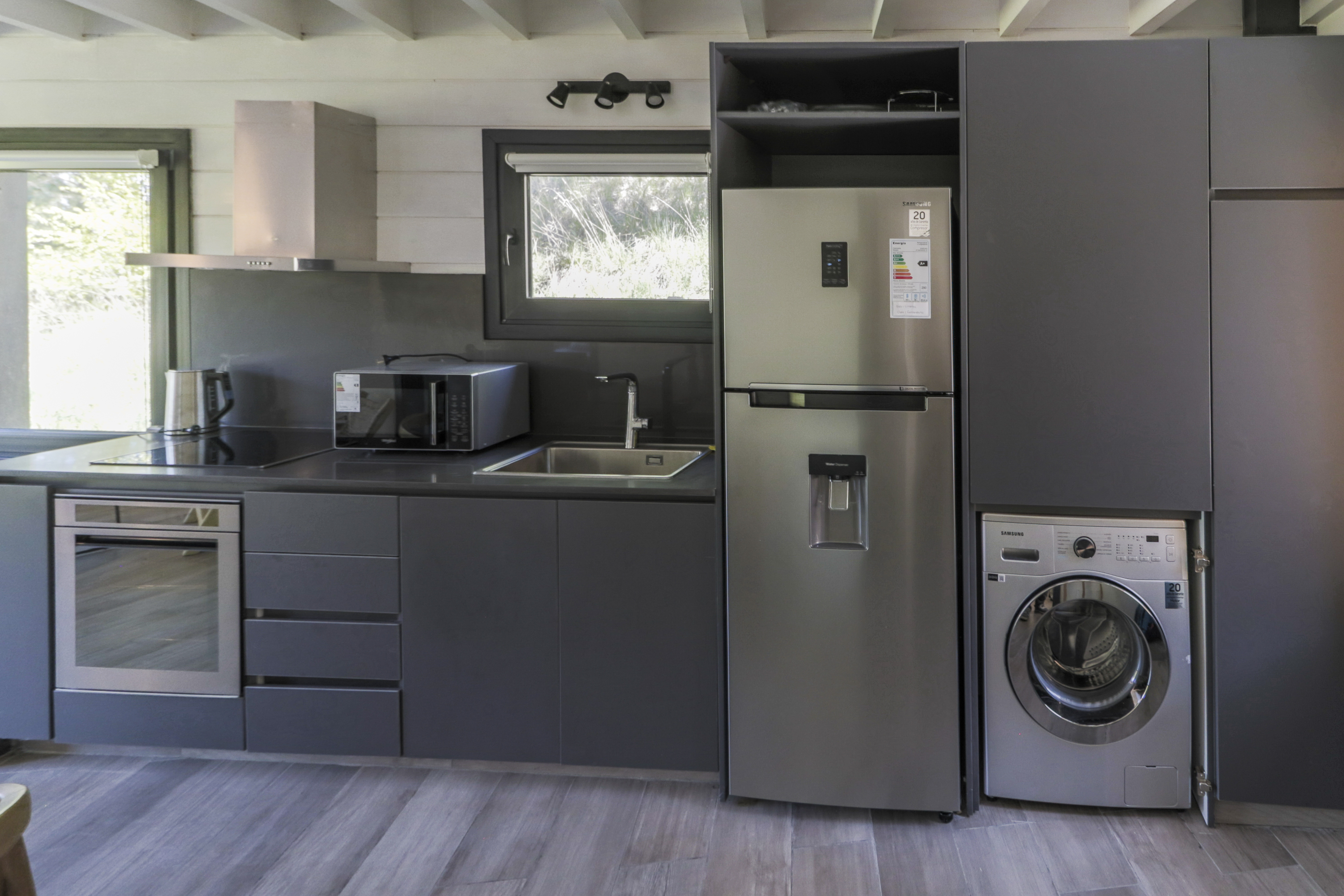 Heladera con freezer, anafe y horno, extractor, microondas, cafetera, pava eléctrica, tostadora y lavarropas